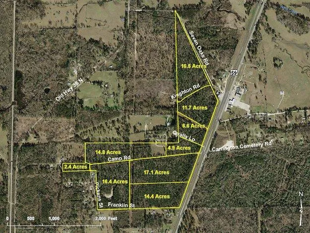 Huge frontage. Investor/developer dream. Located off of Hwy 59 which has 21,000 cars per day on the south bound side alone. All utilities. Many possibilities for division with an abundance of interior frontage. Gently sloping terrain with scattered hardwoods. Recent harvest of pine timber only. Taxes are subject to the size of the property. Owner financing is available with 10% down, 9% interest, over 10-20 years. Please note that the aerial image is for illustration purposes only and does not accurately depict current tree coverage.