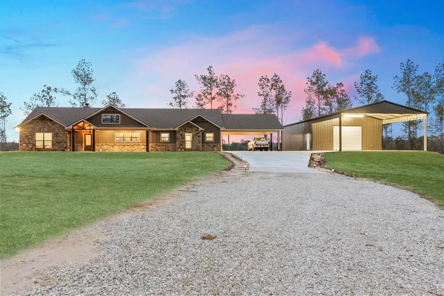 Experience tranquility at High Ridge Ranch with this stunning waterfront home! Completed in 2023, this 2,554 sqft custom residence features 3 bedrooms and 2 bathrooms, highlighted by a grand 14' vaulted ceiling in the living area. Enjoy abundant natural light and breathtaking lake views through large picture windows. The chef's kitchen boasts an oversized island, double oven, gas cooktop, and pot filler, with a walk-in pantry perfect for your coffee bar. The primary suite includes a luxurious en-suite bathroom with a custom tile shower, soaking tub, and expansive walk-in closet. Outside, you'll find an attached carport, spacious back patio, and a 30x40x12 workshop with a 25' gable extension. Deed restrictions ensure the development's pristine condition, with additional acreage available. Just 15 minutes from Lake Livingston, this home offers the ultimate country escape! High Ridge Ranch ...