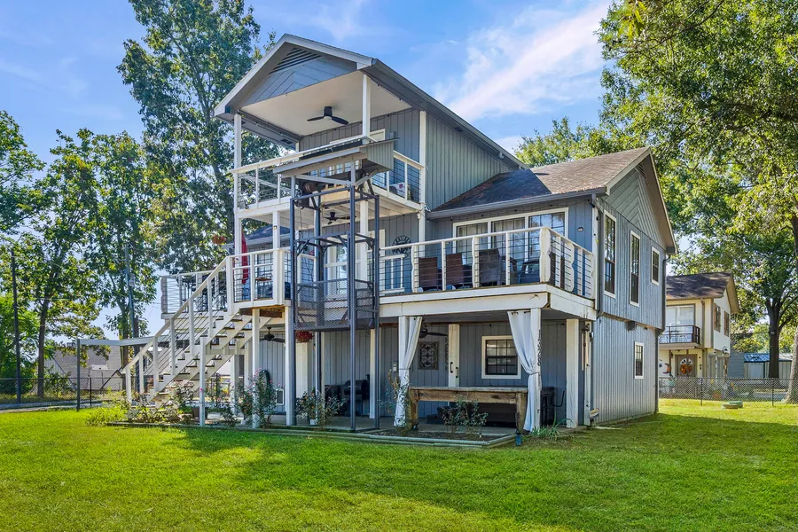 Charming lakeside cottage with peaceful water views from every angle—ideal for a personal getaway or VRBO investment. Sleeps 8–10. The open-concept 2nd floor features living, dining, and a remodeled kitchen with quartz counters, blue tile backsplash, and large pantry. A 30' deck offers sunrise coffee and sunset happy hours. This level includes 2 guest bedrooms (one fits double bunks) and a full bath. The 3rd floor is a private primary retreat with balcony, dual-sink bath, step-in shower, mini-split A/C, and 2 closets. Huge garage includes an A/C utility area with ½ bath—perfect for a game room or 4th sleeping area. Located in a quiet, deed-restricted lakeside neighborhood.