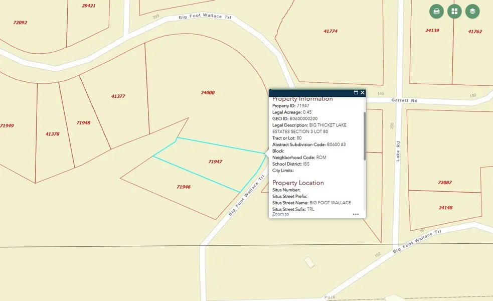 A large vacant lot in the Big Thicket community. Water and electricity available. But there is no sewer system.