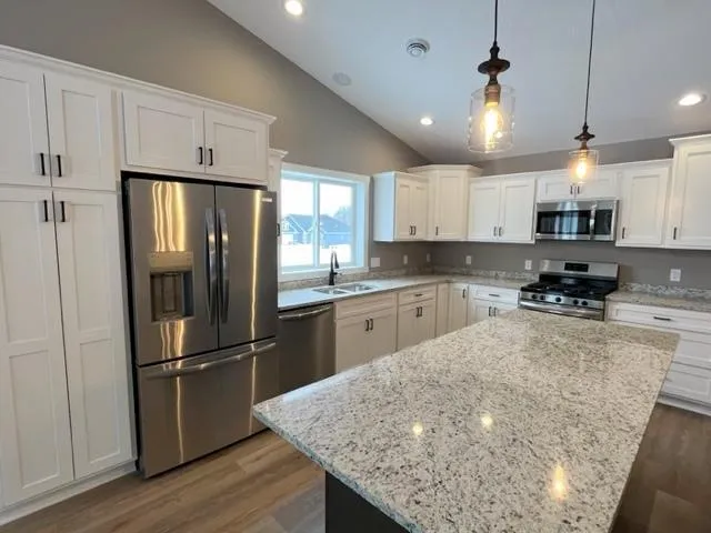 Stunning quality townhouse located in the charming town of St Croix Falls – “The city of trails”. This spacious & modern home is perfect for those seeking a comfortable and stylish living. As you step inside, you'll be greeted by a bright and welcoming living room, complete w/ gas fireplace & large windows that let in plenty of south-facing natural light. The open-concept floor plan flows seamlessly into the dining area and fully-equipped kitchen, featuring vaulted ceilings, high-end stainless steel appliances, granite countertops, and 2-tone cabinets. You'll find a luxurious primary suite w/ a walk-in closet & private bath as well as the 4 season sunroom for relaxing and watching nature as the rear of the home backs up to the Zillmer Park preserve featuring the ice age trail! Enjoy main floor living, so no steps to your laundry room, garage, or living areas making it handicap accessible...
