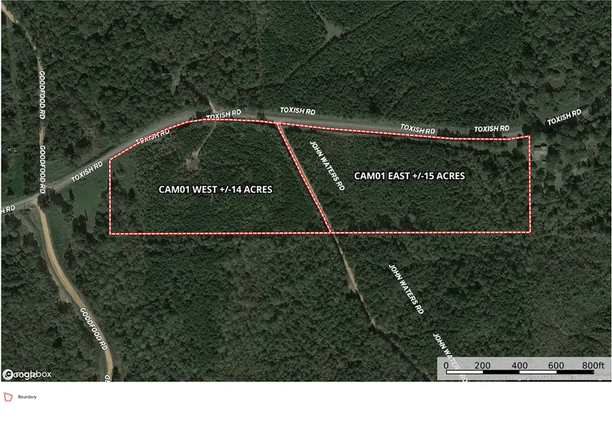 Located immediately SW of the intersection of Toxish Rd. & John Waters Rd.