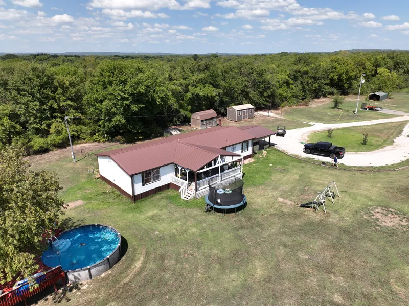 This spacious 3 bed, 2 bath home is 2,128 square feet and contains 2 living rooms. The property has highway frontage and has ~32-35 acres fenced in, with 23 of those acres belonging to the owner and the remaining 9-12 acres belonging to the Oklahoma Highway Department. All 35 acres are available for grazing livestock. A map is included to give a better visual of the property and fence lines. In addition to the house itself, the property also contains an 18 foot above ground pool and two sheds.