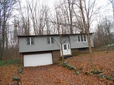 Wooded, 5+ acres, 3 bedroom, 1 bath, 2 car attached garage, rear deck with gravel driveway.