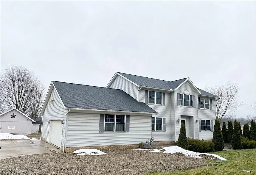 Space, privacy, and potential this 2.83-acre Ravenna colonial offers 2,396 sq ft of living space with valuable recent upgrades already in place. Built in 2005, this home features an open-concept layout and peaceful country surroundings with room to add your personal touch. The main level includes a bright great room with a gas fireplace (10/2021) and a generously sized kitchen with abundant counter space, large center island, pantry, and newer range (3 years old). First-floor laundry with half bath adds everyday convenience. Upstairs, the oversized owner s suite offers a large bath with garden tub, walk-in closet, and expansive changing room. Additional bedrooms provide flexible living space. Major improvements include a full tear-off roof (April 2023) with 30-year shingles and 50-year transferable warranty, septic pumped August 2025, whole-house water filtration system, and battery backup sump pump. Outdoor highlights include a 16x16 deck, paver patio, stamped concrete front patio, dog kennel area, scenic backyard with stream, and multiple outbuildings including a 20x16 workshop for storage, hobbies, or workspace. This property presents an excellent opportunity to enjoy acreage, privacy, and meaningful recent improvements