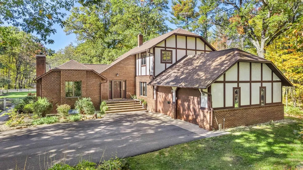 Dreaming of a country home with charm and privacy, this classic brick and stucco Tudor on 9+ acres is the perfect escape. With 3 bedrooms and 2.5 baths, this move-in-ready retreat welcomes you home. Kitchen features granite countertops, abundant cabinetry, and stainless steel appliances. Use the adjoining room as a family room or a dinette. The mudroom serves as the ultimate drop zone, complete with pantry storage, office space, and endless potential. Host unforgettable gatherings in the formal dining room, then retreat to the inviting living room to enjoy the warmth and glow of the gas fireplace. Upstairs is a spacious ensuite bedroom with a private bath and walk-in closet, along with two additional ample bedrooms and a second full bathroom. A deck, paved patio, and fully fenced side yard provide the perfect place for entertaining, enjoying the summer sunshine, or unwinding after a long day. The expansive yard includes a fire pit area and flower beds with perennials that bloom in waves of color, ensuring beauty from spring through fall.