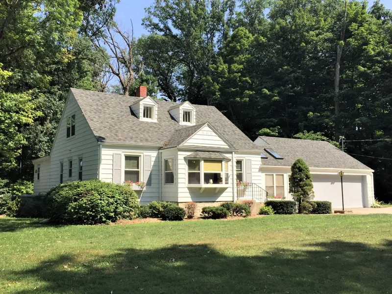 Set on an amazing 5 wooded acres, this 1.5 story home is a blend of country charm & a bit of mid-century modern! Stroll paths through the woods & enjoy thousands of perennials, areas for gardening & camp fires, fruit vines & even a covered bridge! Surprising nooks & crannies add so much character to this 4 BDRM, 1.75 BTH home! An enclosed porch welcomes you! Living room has BLT-in bookshelves. Kitchen, w/lots of cabinets, BLT-in appliances & snack bar is open to family/dining combo w/brick FRPL & wall of windows overlooking the woods! Hardwood floors in 2 main floor BDRMS & under carpet in living RM. Skylights, cedar closet & BLT-in storage galore! Basement has rec room w/canning kitchen & heated workshop w/barn doors to yard! Breezeway leads to 2 car GAR & screened patio w/small kitchen area for entertaining! Screened patio opens to outdoor patio! One car GAR attached to BSMNT for yard tools! Roof 10 yrs, furnace 7 YRS, some new windows! Seller providing a Home Warranty!