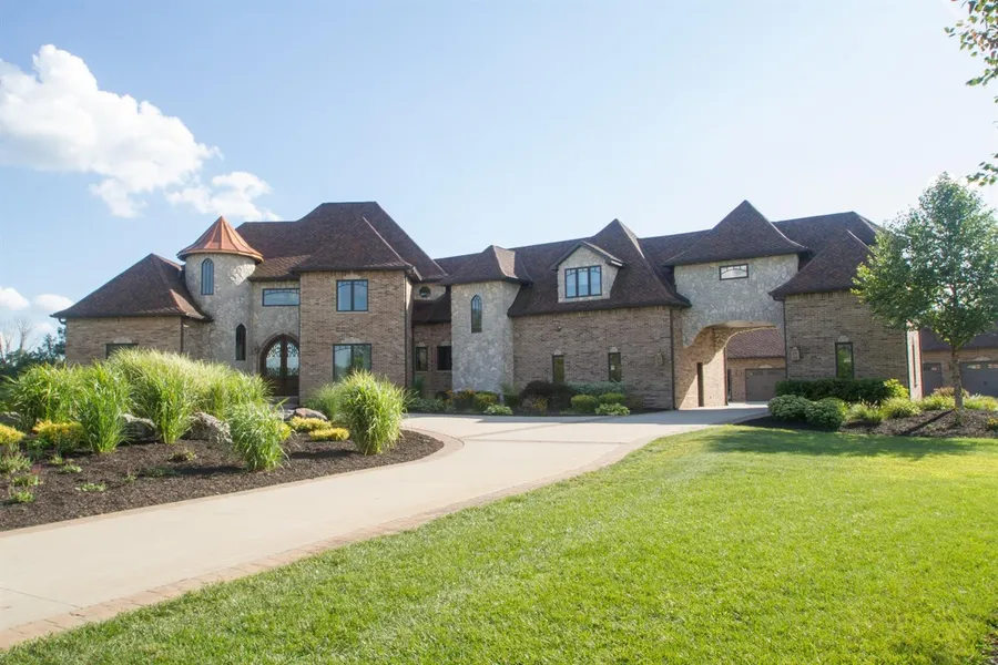 Magnificent gated French Country Estate and heated Carriage House on 12.43 acres. Custom designed brick and stone home features architectural angles and gorgeous French doors and windows, two turrets, custom floor to ceiling windows in Great Room with 20 ft. ceiling, spiral staircase, Tigerwood and Brazilian Cherry floors, huge breakfast bar in chef's kitchen, 2 laundry areas, underground sprinkling, and lush landscaping. Hidden gem features newer in-ground pool and hot tub. First floor spacious master suite has sitting area plus French doors leading to covered Veranda. Closet contains many built-in wood cabinets. Master bathroom with heated floor and steam shower. Two staircases lead to 3 spacious bedrooms upstairs plus large lounge area outside awesome office with custom wood cabinetry and Tudor ceiling. Walkout basement offers wet bar, TV area and home theater. Heated attached garage--garages can accommodate 7 cars. Impeccable home has had many added amenities in last several years.