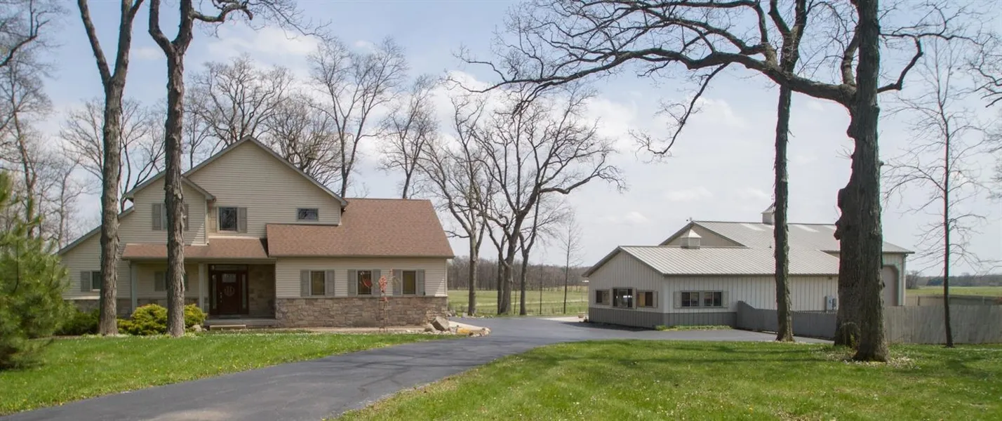 TRANQUILITY AND PEACEFULNESS! Beautiful Prairie-style home on wooded and fenced three acres. Awesome one-of-a-kind POLE BARN meets everyone's dream. Open concept home features elegant natural woodwork and hardwood floors. Spacious foyer leads to vaulted Great Room with gorgeous floor to ceiling stone fireplace enhanced by prairie-style windows offering plenty of natural light. Great Room open to fabulous kitchen featuring hickory cabinets, breakfast island, work island, granite counters and backsplash, and stainless appliances. Kitchen connects to a great office area as well as dining room which overlooks nature. FIRST FLOOR master suite boasts of a sitting room, walk-in closet, jetted whilrpool tub, and tiled shower. Upstairs is a loft area and 2 bedrooms. Walkout lower level includes a framed room. Pole Barn has approximately 900 fin sq. ft. for entertaining or related living-attribute...