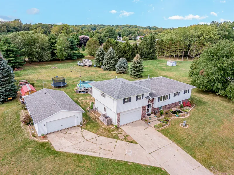 OPEN HOUSE: Sunday (October 24) from 11am - 1pm, Get your shopping done before the Bears game.So many features in this home will blow you away! From the mega-main suite, open concept main living, above ground pool with wrapping deck to the 4-car pole barn and on just over an acre. The main suite is over 500sf with its separate full bath, walk-in closet, study/den and a balcony for your morning coffee. The newly updated eat-in kitchen boasts plenty of counter space, beautiful appliances, built in spice rack and sliders to walk-out on the deck overlooking the pool. The lower level offers plenty of entertaining space with a fireplace and wet-bar set up ready to go. No worry with storage here it is everywhere! The chickens do not stay but feel free to bring your own when you make this yours.