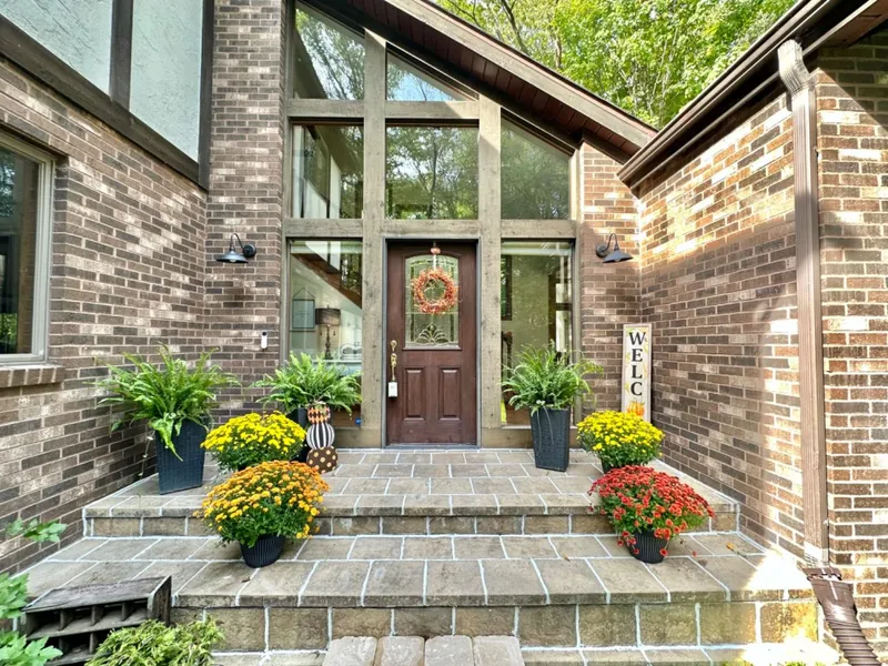 Gorgeous & Breathtaking describe this beautiful Tudor style home tucked into 6.34 serene wooded acres. Watch and witness the beauty of Mother Nature from every room in this home. The interior has been tastefully updated and features an open concept kitchen that flows into the great room with beautiful brick fireplace, large formal dining room and additional living room and finished laundry room. Four Seasons room features walls of sliding glass doors and leads out to new large deck overlooking the picturesque valleys and creek. Upstairs are four large bedrooms with new carpeting and paint, large foyer with ample storage and two updated bathrooms. The basement was recently finished featuring an industrial style vibe. The acreage has all the privacy one needs with walking paths, along with an outdoor screened in building and additional garage located. Updates include new roof, two new decks, garage door, bathrooms, appliances, paint, carpeting, flooring, and gorgeous landscaping.