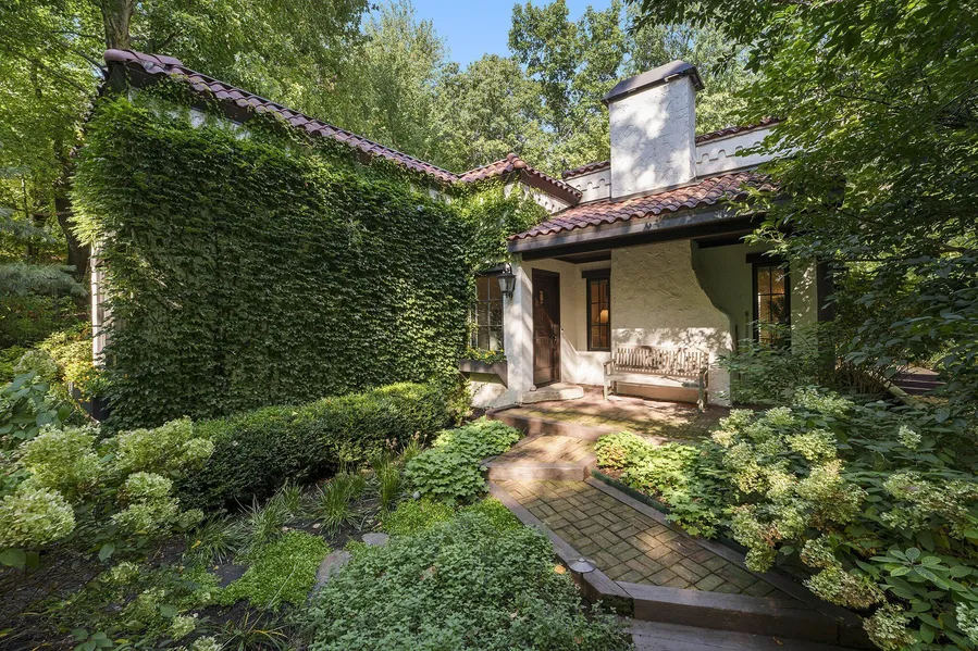 This luxury property is unsurpassed for those seeking a relaxed lifestyle surrounded by natural beauty. The two, possibly three bedroom, three-bathroom Spanish Revival home, originally built by Frederick Bartlett, was entirely reconstructed in 2016 with an architect's skill, an interior designer's impeccable eye and no expense spared. Set on a dune surrounded by lush landscaping, the home's charming stucco exterior, red clay tile roof and delightful entry welcome you. Inside, spacious, sunny rooms flow easily and the floor plan seamlessly integrates the indoors with the outdoors making this an exceptional home for comfortable living and entertaining. A dramatic two-story fireplace anchors the living and dining areas and the well-appointed kitchen with custom cabinetry, induction oven and suede finished marble countertops opens to the most enchanting brick garden patio for quiet retreat, al fresco dining and gatherings under the stars. The primary suite is thoughtfully separated on the main level for privacy and features a spa-like bathroom, a professionally organized walk-in closet and an office. A cozy den with a wood burning fireplace leads to a screen porch surrounded by trees where you can unwind listening to the tranquil sounds of nature. Upstairs there is a generous size room overlooking the courtyard that offers flexibility for guests, a 2nd bedroom and a full bathroom. Exquisite finishes that lend to the home's warmth and historical past include high ceilings, recessed lighting, tall windows, wide plank, hand scraped hickory wood floors, arched molding, a wrought iron stairway and exposed ceiling beams. This is your opportunity to own one of Beverly Shores' finest homes. 106 East Idler is as versatile as it is magical -a private sanctuary for retreat and connection.