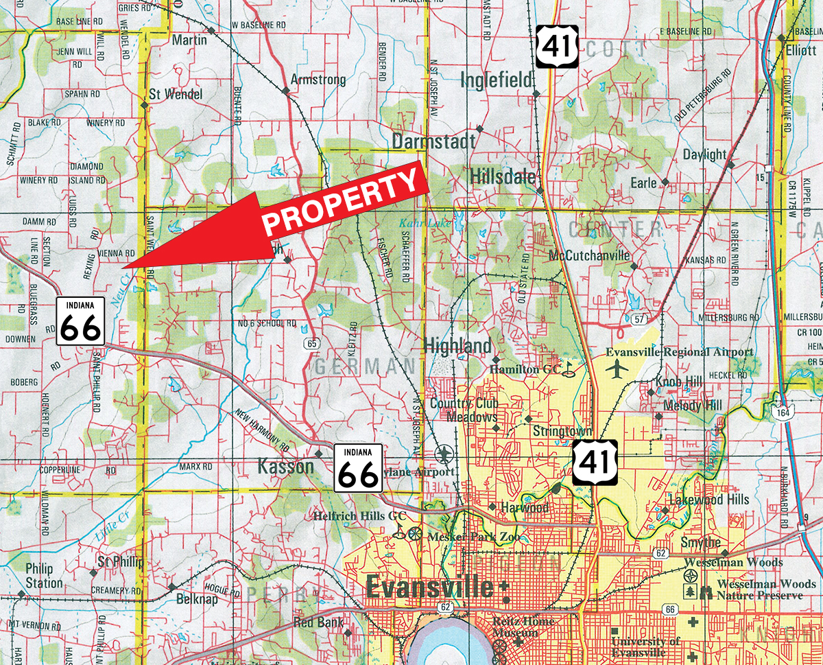 PROPERTY LOCATION:Located 1.5-miles north of Indiana State Road 66, this property has frontage along Vienna Road and is uniquely located for good access from Posey County or Vanderburgh County.