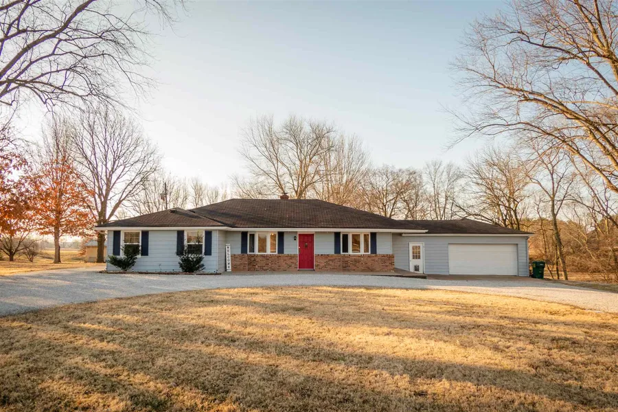 Country and close to town. Large bedrooms kitchen with wood burning stove, wood cabinetry and large walk in pantry. Replacement windows thru out. Hall bath has whirlpool tub and shower and tile floor. Some wonderful features of this home include: mudroom with sink and storage cabinet, 2 car attached garage, additional 20x30 detached garage, circle drive, front porch back patio, 12x30 carport. Included in sale, fridge, dishwasher, stove, carport. All on 1.7 rolling acres.