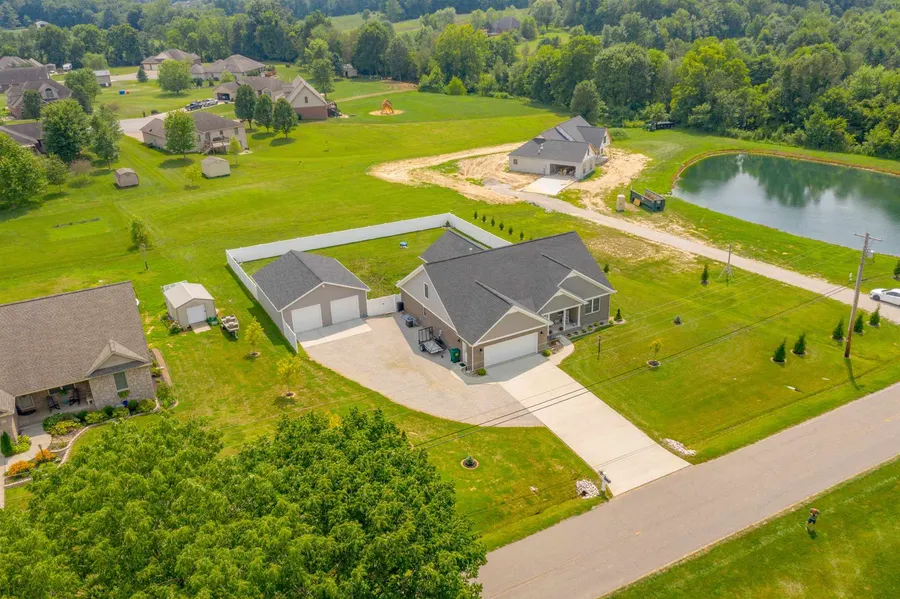 Located just 10 minutes west of USI in the St. Phillips area, this almost new home has a versatile floorplan, a 2.5 car attached garage, a detached 28x32 garage with 3 overhead doors, and a large covered rear patio all sitting on a one acre lot. Come into the home from the covered front porch to find an open living and kitchen space with large center island. Custom shiplap fireplace with gas logs and mounted 75" TV included in sale. Modern and subtle gray tones throughout the home, including the engineered hardwood flooring on the main level. The kitchen features Kitchen Jewel brand hickory cabinets with "soft close" feature, granite counter tops and Blanco granite sink, glass tile backsplash, dark stainless steel appliances, and spacious raised bar at the center island for several barstools. Eat-in kitchen area has patio door to the oversized 20x22 covered rear patio. The HUGE backyard ...