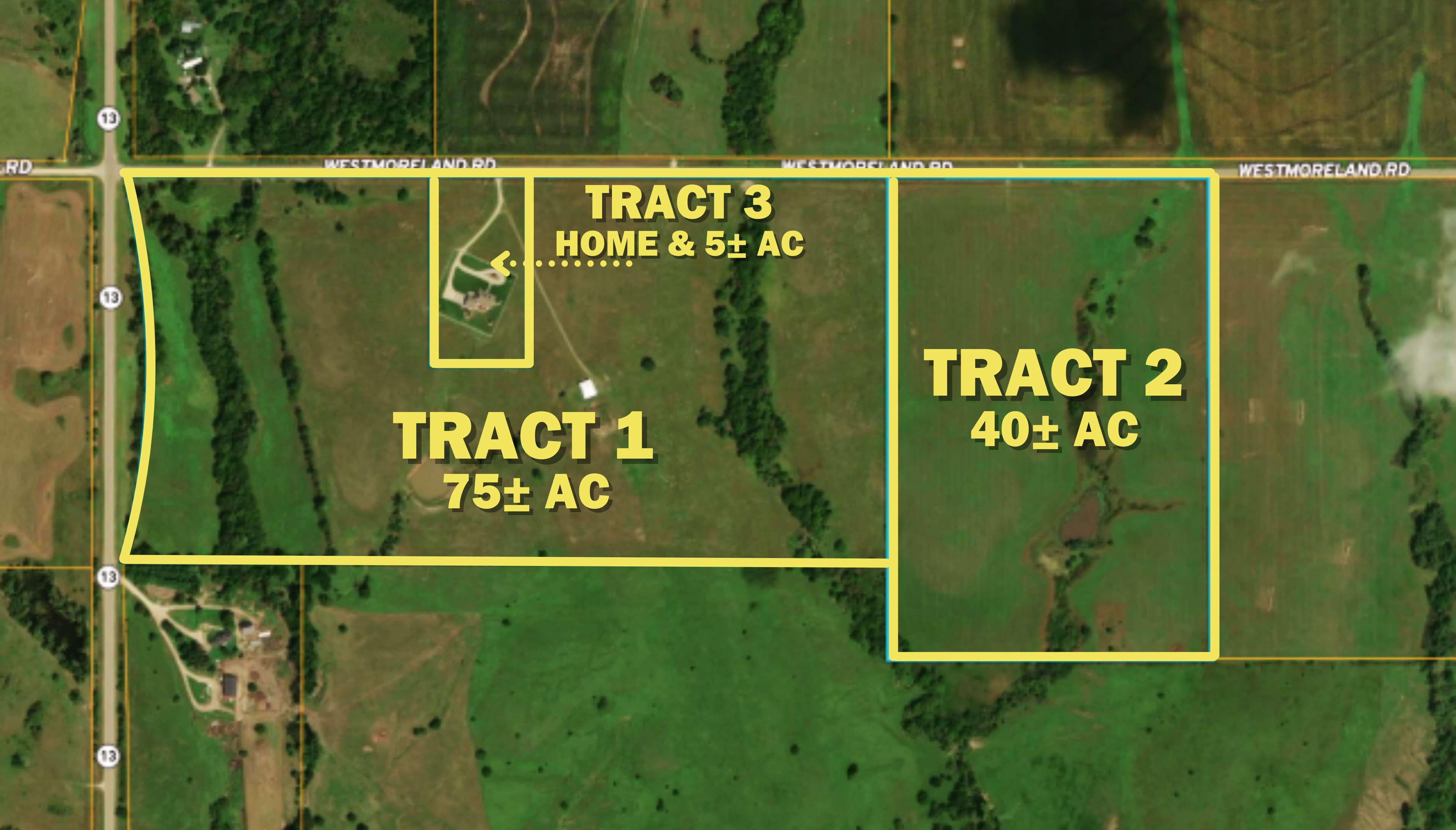 Rare opportunity to acquire 120+/- acres of rural Kansas land with a beautiful residence and versatile grassland, ideally located at the corner of Hwy 13 and Westmoreland Rd., just northwest of Westmoreland, Kansas. With pastureland in this area rarely coming to market, this is an exceptional chance to invest in quality land with multiple purchase options. Buyers can bid on the 75+/- acres, 40+/- acres, the home with 5+/- acres, or any combination including the entire property!
