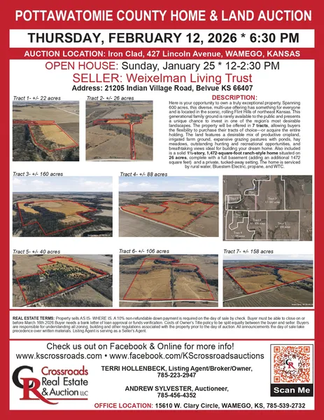 Here is your opportunity to own a truly exceptional property. Spanning 600 acres, this diverse, multi-use offering has something for everyone and is located in the scenic, rolling Flint Hills of northeast Kansas. This generational family ground is rarely available to the public and presents a unique chance to invest in one of the region’s most desirable landscapes. The property will be offered in 7 tracts, allowing buyers the flexibility to purchase their tracts of choice—or acquire the entire holding. The land features a desirable mix of productive cropland, irrigated farm ground, expansive grazing pastures with ponds, hay meadows, outstanding hunting and recreational opportunities, and breathtaking views ideal for building your dream home. Also included is a solid 11/2-story, 1,472-square-foot ranch- style home situated on 26 acres, complete with a full basement (adding an additional 1...