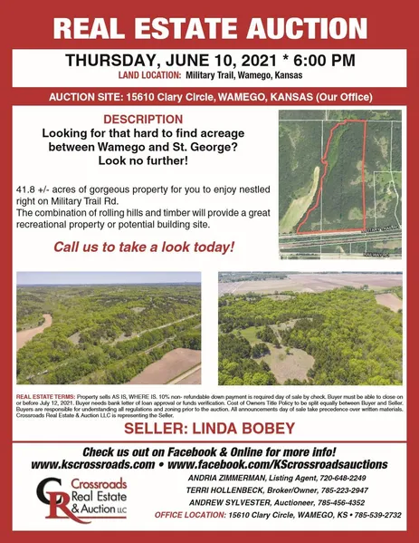 This property is a unique opportunity as it sets adjacent to Military Trail Road (paved) with easy access to Wamego, Manhattan and St. George. With good timber and views it should provide a good fit as a recreational property or potential building site. Call today for more information!