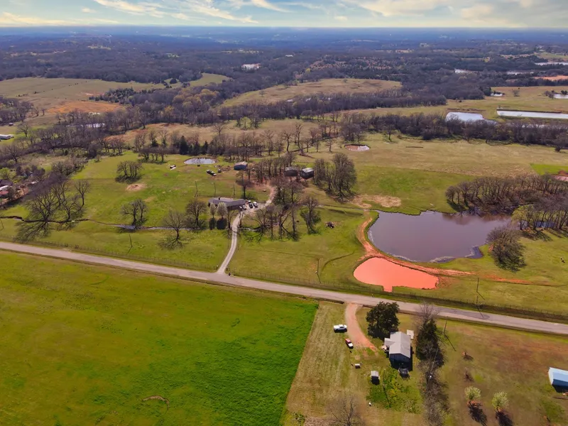 Check out this multi-recreational property that includes a 3 bedroom, 2 bath, 2100+ sq ft home with almost 2,000 ft of road frontage located on 32.5 acres. Equipped with fiber optic internet and a Generac generator, this homes functional floor plan features a charming interior, and a spacious formal dining room. With professional-grade high-end stainless-steel appliances, the kitchen includes a commercial fridge, dishwasher, and gas stove. The back door allows access to a fenced in sport swimming pool complete with a patio perfect for entertaining. Surrounded by seamless pipe rail fencing, this well-rounded estate also includes a steel corral accompanied by its three custom built shops. Youll love this charismatic property that promotes recreational activities and gorgeous views of the surrounding acreage with quick access to a seasonal creek, and three scenic ponds.