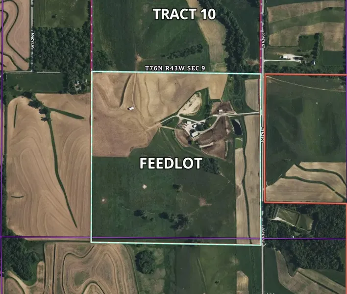 This tract features feedlot facilities and other buildings 550 open capacity, 4700sq. ft building, 1600ft pole building, garage, shed home cemented bunker silos and 11.64 acres of cropland. Subject to a cash rent lease for 2025.