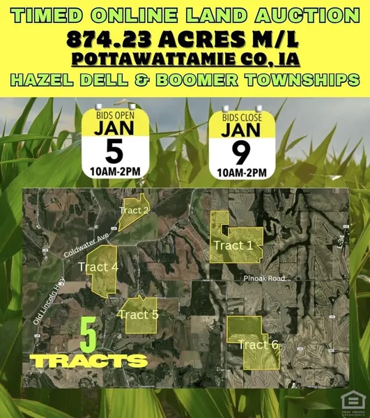 LAND AUCTION - ONLINE ONLYBIDDING OPENS 1/5/26BIDDING CLOSES 1/9/26Highly attractive tract of land with an average CSR2 rating of 67.8 with approximately 73.51 FSA cropland acres. Excellent location on Coldwater Ave with close proximity to Crescent, minutes to Mormon Bridge and North Omaha. Parcel of land could accommodate 5 houses with more available if doing a minor subdivision. Sells subject to a cash rent lease for 2025. Full possession for 2026Tax Parcels: 774332300012; 764305100003; 774332400004; 764305200001