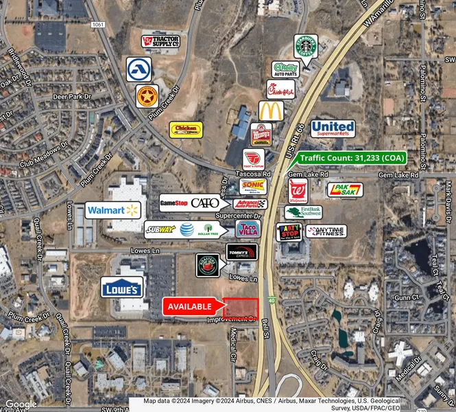 Located in northwest Amarillo near the medical center and Craig Retirement Center. Extensive retail area which includes: Walmart, Lowe's, Walgreens, Happy State Bank, and Amarillo National Bank.