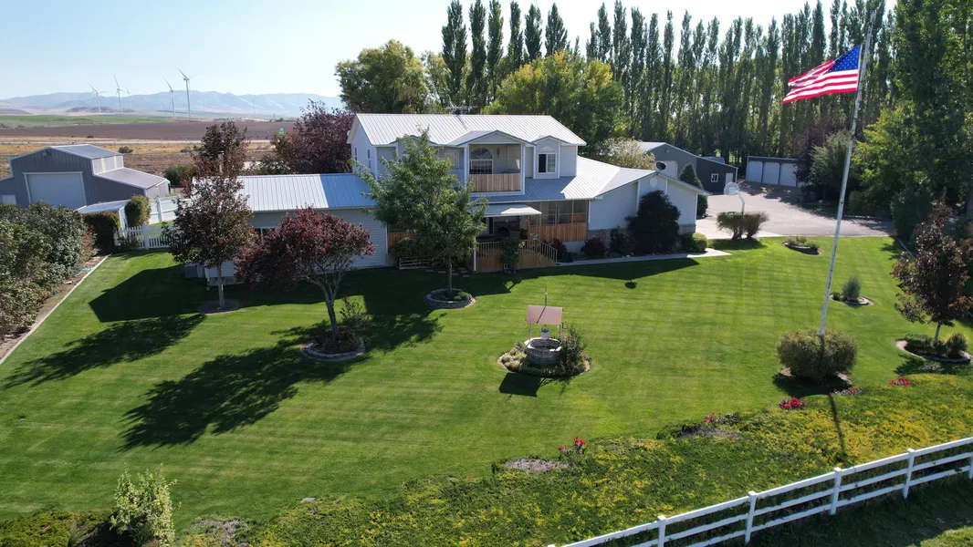 This stunning property offers breathtaking views of the Snake River and the surrounding farmland. The meticulously landscaped grounds feature mature trees and lush perennials, creating a serene and picturesque setting. The property includes several well-maintained outbuildings: a barn with a tack room, a separate livestock shelter with horse stalls, a machine shop with a woodworking facility, and a five-bay storage building.