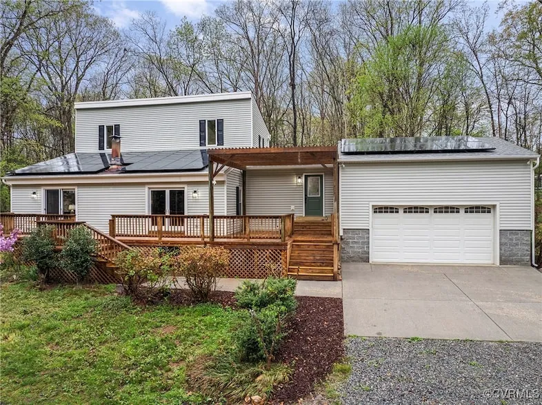 Welcome to 2889 Red Lane Rd, this stunning CONTEMPORARY style home with a 2.5 CAR GARAGE (w/ 16 foot ceilings) is equipped with a FULL SOLAR SYSTEM including battery backup (2021) & a high quality renovation affording you all the luxuries you've been looking for - located in eastern Powhatan! With 3 bedrooms, 2.5 bathrooms, 1960 Square Feet & situated on a 2.5 acre lot this is a one of a kind property! As you pull down the private s-turn driveway you are met w/ tons of curb appeal from the mature landscaping to the oversized front deck w/ pergola & NEW front door. Entering the home you're met w/ NEW Engineered hand-scraped birch hardwood floors throughout (2025). The spacious living room boasts a wood burning fireplace, exposed solid wood beams, tongue & groove pine walls, vaulted ceilings & french doors leading out to the oversized front deck. No detail was overlooked in the fabulous ne...