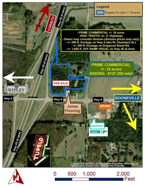 ** UNDER CONTRACT ** PENDING SALE ** Situated at the HIGH TRAFFIC & HIGHLY VISIBLE intersection of Hwy 45 and W. Chambers Dr. (aka Hwy 4), this is the perfect location for a gas station/truck stop, hotel, or restaurant. Located between Tupelo and Corinth, this property is zoned C-3 Highway Commercial and is in the Booneville City Limits! It has frontage on 2 major highways and a city street. Don't miss this great opportunity! CALL TODAY!!