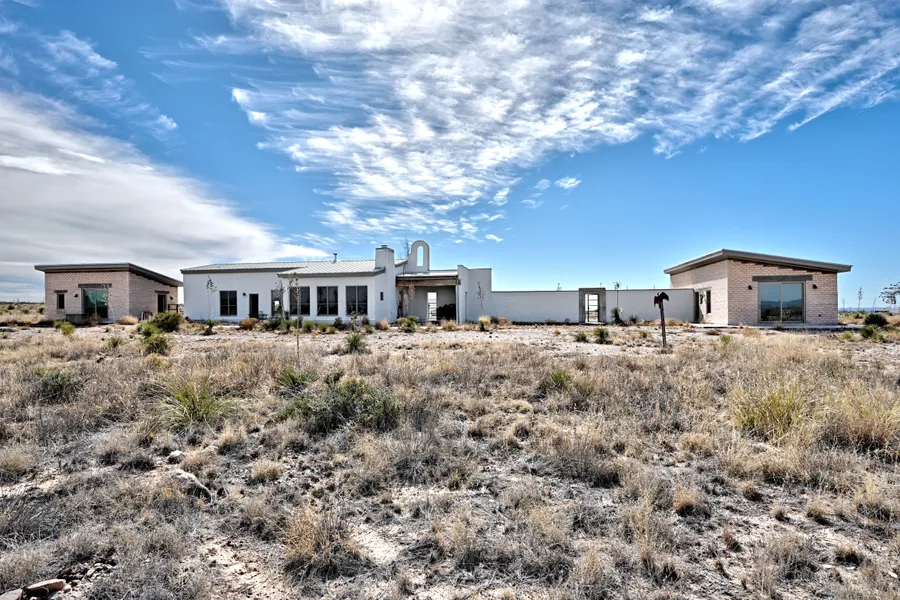 Set on 15 acres with an unobstructed view of the Davis Mountains, Blue Mountain, the Puertacitas and Haystack Mountain. The hacienda is a sprawling complex of three structures all connected by walkways, patios and garden, shielded from Antelope Hills Road by adobe walls and accessed through architectural steel gates. The passive solar designed adobe soft contemporary hacienda has four (potential 5th) bedrooms and five full baths.