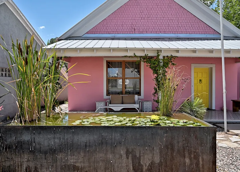 At the rear of the lot, just across the alley from the Hotel Paisano, is the 480 square-foot adobe studio. This low slung, vernacular structure was once a barn, and its rustic, plaster coated walls remain a prominent element in the updated design. With its raw wood ceilings, concrete floors, and elegantly-designed bathroom, the Studio is a stellar combination of old and new Marfa.