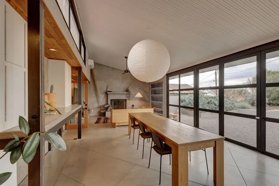 At the core of the main home, the kitchen features concrete countertops, white lower cabinets and warm wood shelving that are complimented by sleek stainless appliances and a terracotta backsplash. The refined formal living area is lit by a tumbleweed chandelier and is next to the custom, built-in dining nook. The adjac...