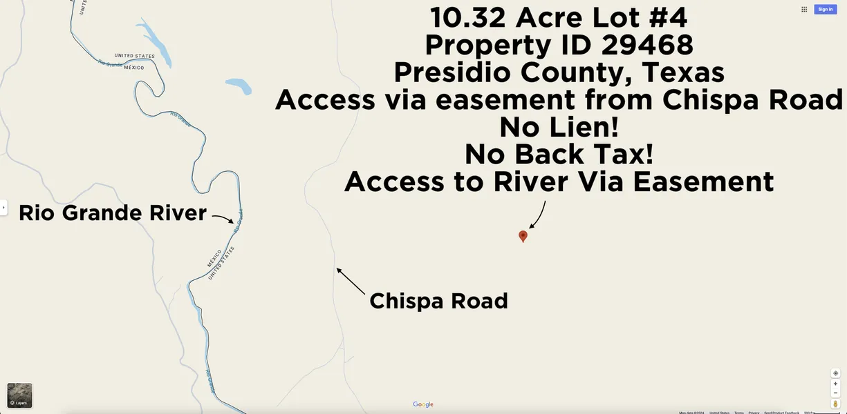 Legal Description: LOT 4, A 10.32 ACRE TRACT OUT OF THE NORTH HALF OF SECTION 65, BLOCK 2, T&P RR COMPANY SURVEY, PRESIDIO COUNTY, TEXAS.