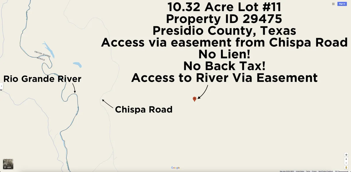 Legal Description: LOT 11, A 10.32 ACRE TRACT OUT OF THE NORTH HALF OF SECTION 65, BLOCK 2, T&P RR COMPANY SURVEY, PRESIDIO COUNTY, TEXAS.