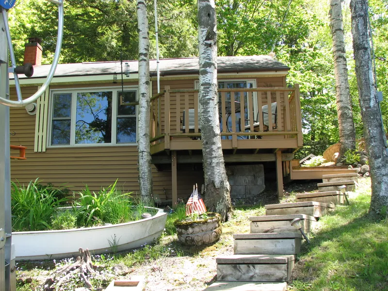Cozy 3 bedroom, all season cabin with a knotty pine interior. The living room has wood floors and a wood burning stove. The kitchen features knotty pine cupboards, vinyl flooring and a patio door to the deck overlooking the lake. This is furnished and ready to move into. It also includes a wood shed, fire pit, a beautiful patio and a 16x24 detached garage. Recent improvements include a new dock, new patio, new siding, windows and insulation. It has LP gas and wood heat, conventional septic, and a shared well.