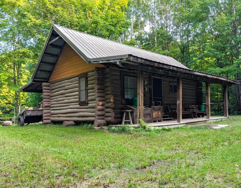 Tucked deep in the woods near Lugerville in Price County, this log cabin and 25 acres captures the nostalgic charm of a true Northwoods hunting camp. Accessed via a private easement that puts you a quarter mile off the nearest road, the setting is as secluded as they come. The cabin is heated by a woodstove and LP wall furnace, set up for generator power as well as gas lights. A huge benefit of this property is having direct access to nearly 500 acres of bordering State-owned land with limited public access. A garage on a slab provides storage for ATVs, gear, and equipment, a wood shed, privy, and sauna add to the authentic camp experience. The land itself is ideal for hunters, with 4 enclosed deer stands, a network of trails, and a micro food plot. What a great property to hunt deer, bear, grouse, or turkey on with additional room to roam! This property offers seclusion, tradition, and access to lightly pressured public land, making it the perfect place to write your own Northwoods stories.