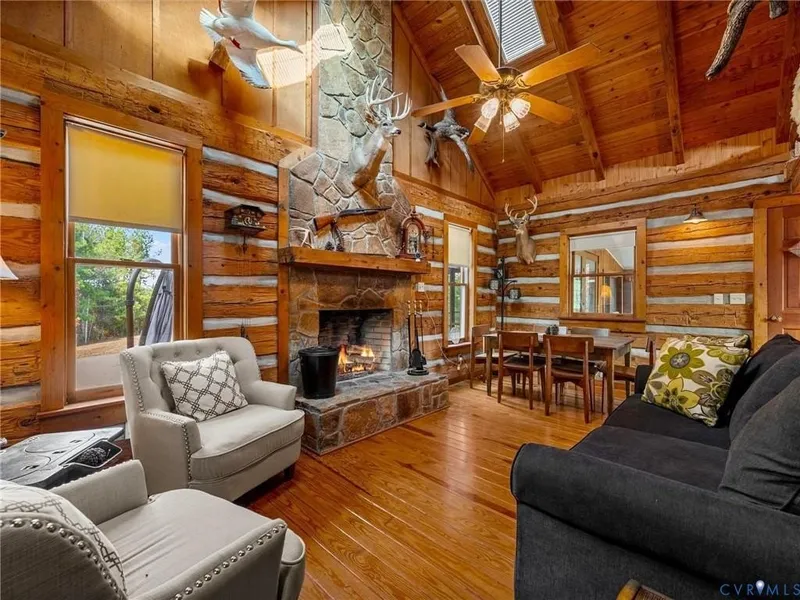 'CABIN COVE', a SECLUDED WATERFRONT RETREAT that will make every day feel like a holiday! The custom built cabin on a knoll in the forest overlooking a completely owned LARGE STOCKED POND, is just outside of Farmville and was built with Southern Red Pine from a cabin in Kentucky. Drive down the long, winding PRIVATE driveway to your very own secluded getaway on 6.1 acres with all the comforts of modern amenities. There is so much to enjoy; FISHING, KAYAKING, SWIMMING, HIKING, EXPLORING, CAMPFIRES, HUNTING, WATERFRONT PAVILION PARTIES & MORE! The cabin boasts a floor-to-ceiling STONE FIREPLACE in the family room, dining area open to full kitchen with farm sink and island (and ALL APPLIANCES), WATERFRONT from the sunroom (which could be used for a guest room), LARGE SCREENED PORCH, cozy loft bedroom with walk-in closet, laundry closet with washer & dryer, beautiful sparkling rustic bathroom with ceramic tile and glass shower door system, decks-both covered and open, large patio, and BREEZEWAY to the OVERSIZED 2-CAR GARAGE/WORKSHOP! Additional features include; GORGEOUS WOOD FLOORS & WALLS, a WHOLE-HOUSE GENERATOR, heat pump, water softener, FENCED BACKYARD and so much more!