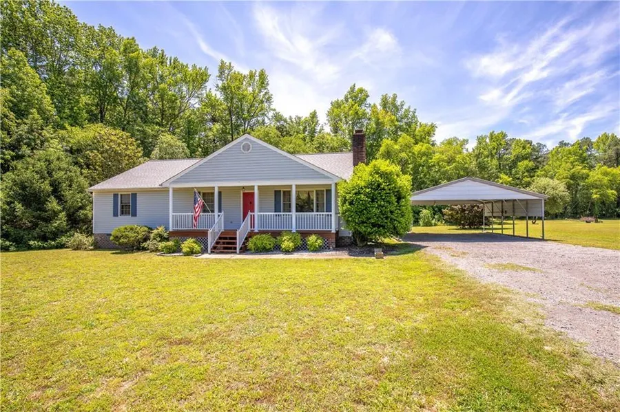 Check out this 3 bedroom, 2 full bath rancher sitting on 5 acres of your own quiet paradise. Located in Prince George close to interstate. Enjoy your morning coffee on the covered front porch, then a cookout in the afternoon on the rear screen porch. Maintenance free exterior of vinyl siding and windows, and aluminum handrails. Enter the home into the large living room with LVP flooring, masonry fireplace, ceiling fan, crown mold, and chair rail. From the living room enter the large eat in kitchen with new vinyl floor. 3 large bedrooms with carpet, and ceiling fans. Pantry in kitchen, and washer and dryer access in kitchen. Water heater replaced in Feb. of 2022. Dimensional shingle roof replaced in July of 2017. Heat pump just serviced. Although no known defects the fireplace and flu, refrigerator, washer and dryer, exterior shed, and 24 x 26 carport convey "as-is".
