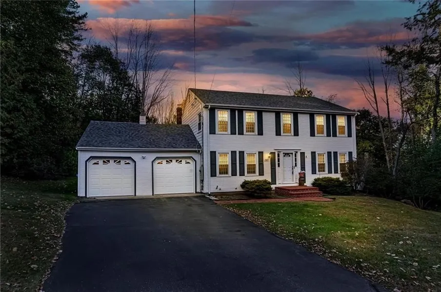 Set on nearly 1.5 tree-lined acres in North Smithfield’s highly desirable school district, this spacious 10-room Colonial offers nearly 3,000 sq ft of living area designed for both comfort & entertaining. Located near Wright’s Dairy Farm with convenient highway access, the property features generous front & back yards providing privacy & space to enjoy. Inside, the main level includes a formal living room, full dining room with picture frame molded wainscotted walls, eat-in kitchen, & cozy den with wood-burning fireplace. A three-season porch extends off the kitchen and continues onto modest deck leading to back yard, perfect for relaxed gatherings. Upstairs, the massive primary suite includes an en-suite bath & dual closets. Two additional bedrooms include one with custom hand-built cabinetry & stained glass accents perfect for reader, sports fan, or work from home family member. The finished basement features a built-in bar, 2nd wood fireplace, large open space & w/walk out to backyard & half bath is ideal for indoor/outdoor entertaining. Additionally there's new upstairs carpeting, updated flooring in key areas, 2 car garage, & first-floor laundry. Oversized additional garage is perfect to store lawn equipment, boat, or other fun equipment. Low maintenance with young roof & heating system & central air for comfort. Add your own design touch to personalize or enjoy the classic nature of the exposed beams & rustic charm. Come view this classically beautiful property today!
