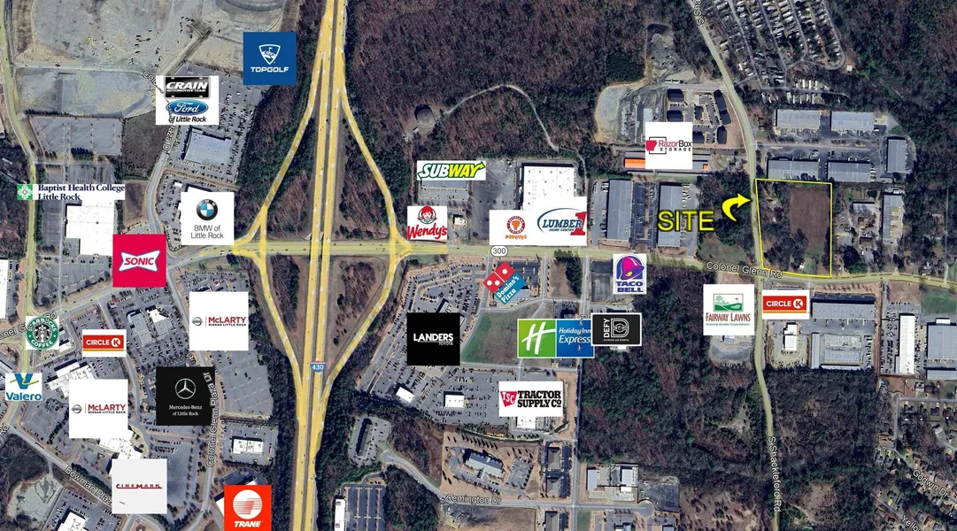 For Sale, Lease or Build to Suit! Approximately 7.3 Acres of Level Vacant Land. This Property is Zoned Service Trade District on the Land Use Map but could be Rezoned for Various Commercial Uses. Great Location at the NE Corner of Colonel Glenn and Shackleford Road with a Traffic Signal. Less than Half a Mile from I-430 and Less than 1 Mile from Topgolf. Traffic Counts on I-430 are +/- 83,000 VPD and +/- 15,000 VPD on Colonel Glenn. This Property also has 2 Residential Income Producing Properties.