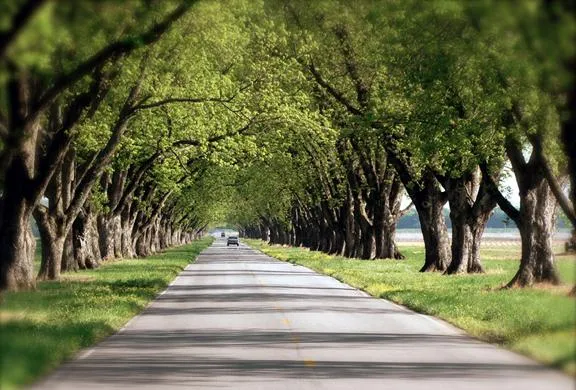The approach to the property from the north on Highway 161 is a straight road through flat fields, dramatically transformed by a line of pecan trees on each side of the road which runs for 1.25 miles. These trees have grown to form a canopy over the road and provide a striking scene and feel of southern nostalgia.