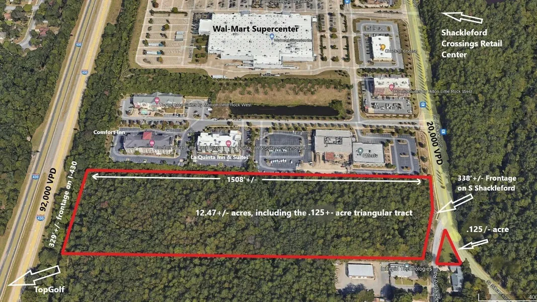 NEW PRICE! This 12.47+- acres Little Rock commercial development opportunity is strategically located just south of the popular Shackleford Crossings shopping center, Wal-Mart Supercenter, a busy hotel complex and has 340'+/- of frontage on I-430. The property is high and dry and includes a triangle -shaped, 0.125 acre tract at the intersection of S Shackleford and Shackleford Pass, a perfect spot for a small coffee kiosk. Surrounding businesses include Comfort Inn & Suites, La Quinta Inn, TownePlace Suites by Marriot, Wal-Mart Supercenter, Main Event Little Rock, Longhorn Steakhouse, Texas Roadhouse, Cracker Barrell, and Top Golf Little Rock. Contiguous property is a newly-developed self-storage facility.