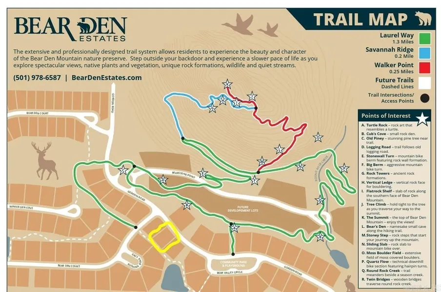 This lot and community is nestled at the foot of Bear Den Mountain! This green development emphasizes preservation, offering beautiful walking, hiking, and biking trails. The community also features a newly completed playground area. This wonderful location provides easy and quick access to Chenal Country Club and all the amenities West Little Rock has to offer.