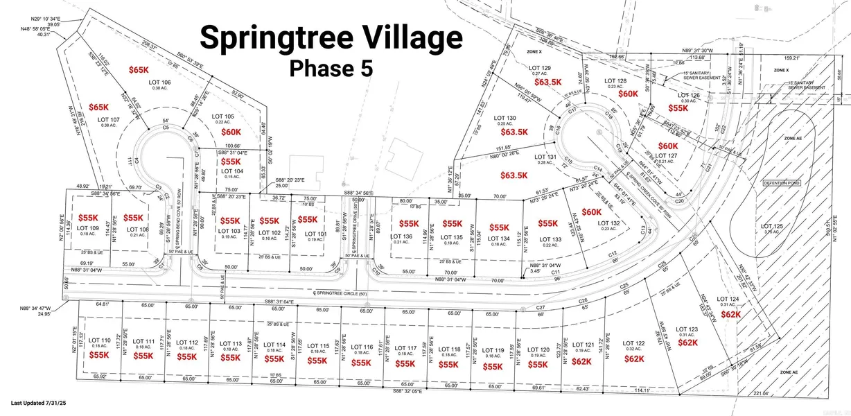 Springtree Village Phase 5, with entrance at Springtree Dr and Sandbridge Dr. New construction homes with select customization available, including colors, flooring, and light fixtures. Seller is offering a $3,000 closing cost credit on presale lots and homes. Each home includes a 1-year Builder Warranty and offers 3- and 4-bedroom floor plans ranging approximately 1,500, 1,600, or 1,700 sq ft. Standard features exceed typical spec homes and include canned lighting, tray ceilings, ceiling fans with light kits, granite countertops, architectural shingles, garage doors with openers, and fully sheetrocked and painted garages. Optional upgrades may include a fireplace, extra trim and molding, kitchen island, quartz countertop upgrades, double French doors with internal blinds, fully tiled step-in showers, solid surface bedroom flooring, extended covered patios or step-out areas, upgraded appliance packages including washer, dryer, and refrigerator, attic stairs, and floored attic storage. Lot dimensions and acreage are estimated from the plat map; buyers should calculate and verify their own lot size. Taxes are unknown. Model photos are from Phase 4.