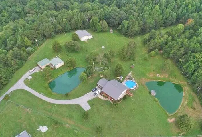 Rare offering with spacious newer ranch-style farmhouse on 135 private acres! This 2012 custom-built home contains approx. 3,200 SF including the finished walkout basement. It features 4/3 bedrooms, 3 full baths, hardwood & tile flooring, fireplace, above-ground pool, 2-car attached garage, 1-car garage in basement, oversized 1-car detached garage/workshop, 2 barns for livestock, and large equipment barn with extra stalls on the side. There are 3 large stocked ponds (2 with docks) & the property is fenced for livestock. The setting is tranquil & breathtaking. Both cleared & wooded acreage with trails & creeks. Property has abundant wildlife with many great hunting spots. The relaxing home offers a front porch, back porch, lower patio, hot tub, and so much more!! There are two bedrooms & 2 baths upstairs with an additional bedroom & bath downstairs, plus built-in double bunk beds off the family room that can easily sleep 4 adults for a fourth bedroom. If 135 acres is too much to take care, the property may be purchased with less acreage.
