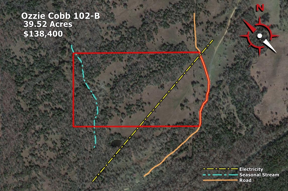 Ozzie Cobb 102-B is a 39.52 acre property with nice mix of forest and native grass meadows. Power runs through the property and a seasonal stream runs from North to South along the Western portion of t...