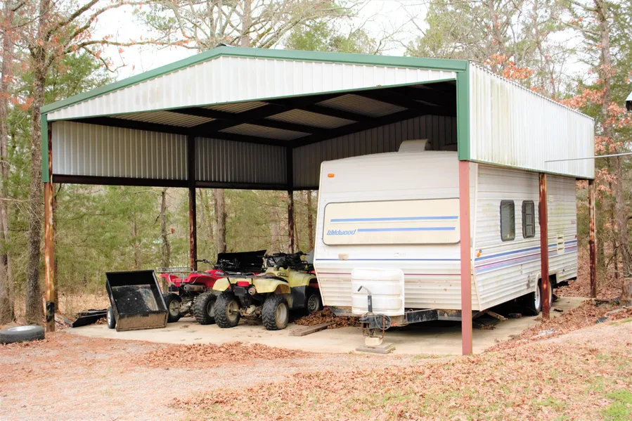 Escape from the everyday! Nestled on over 6 acres, this home is far enough off the road to offer plentiful privacy and peacefulness. The outdoor enthusiast will appreciate the 24x26 heightened metal carport, which will easily accommodate an RV/boat with ample room left over for additional recreational vehicles. As if that were not enough, there are more storage options just steps away in the 24x40 metal shop with two garage doors for ease of parking inside, in addition to a standard door for entry. The shop has a window for natural lighting and is also equipped with electric service. Additional covered parking offering shelter from the elements is provided by the large three-car carport attached to the home. At the back of the home, outdoor entertaining and relaxing evenings are easily accomplished by taking advantage of both of the patios, one covered and one open with a large fire pit. You will enjoy the ability to see towering trees surrounding you in each direction, and the beautiful boulders that dot the landscape are a distinct reminder the Kiamichi Mountains are just moments away. Dont be surprised if wildlife visits your lovely property as well. The creek running along its eastern border is a water source for whitetail deer that inhabit the area. After all, there is a reason Kiamichi Country bills itself as the "Deer Capital of the World.