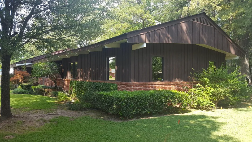 The 2384 sq. ft. home was built in 1960 and boasts beautiful wooded walls inside and out. It has back to back living areas with each room containing electric log fireplaces. The front room measures 38' x 13.5' with a formal 10'x10.5' dining room. The second room measures 27' x 10' and features a breakfast nook along with in-home cellar. Both living areas have large built in book cases.