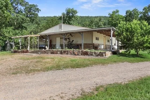 Welcome to this stunning 3-bedroom, 2-bathroom custom barndominium-style home nestled on 40 acres at the base of the Kiamichi Mountains. Built in 2015, this residence features a modern, open-concept design with easy-to-maintain tile floors throughout. The home is wrapped with 1,000 sq ft of covered porches, perfect for enjoying mountain views and outdoor living. Stone accents along the skirting and garden beds add charming curb appeal.