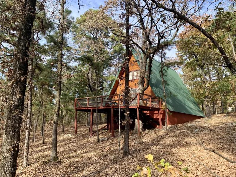 This is a cozy A-frame cabin located in a scenic and recreational area of southeast Oklahoma in the Kiamichi Mountains. This cabin offers a full kitchen and bathroom, along with heating and air, and enough room to sleep multiple people in the loft and lower level. The cabin sits on 4 acres with rural water, electric, and septic system. Surrounding the cabin is an abundance of huge short leaf pine trees and various hardwood timber that really creates that mountainous setting for a weekend getaway. The property is just a short 5 minute drive to the near by town of Clayton OK, which has everything you would need for a weekend trip.